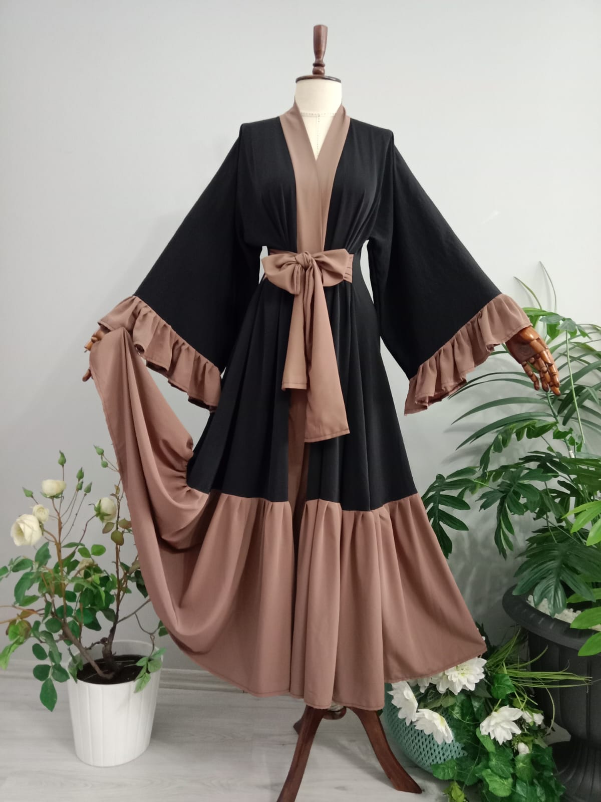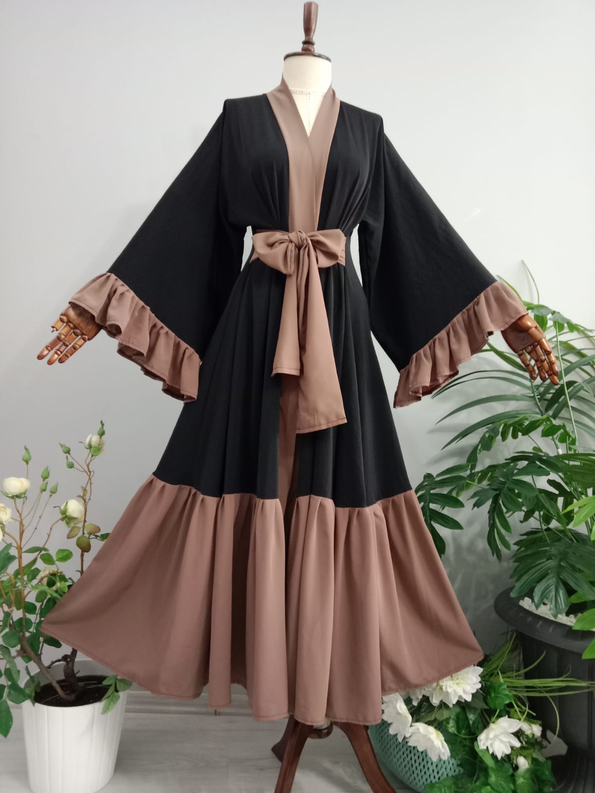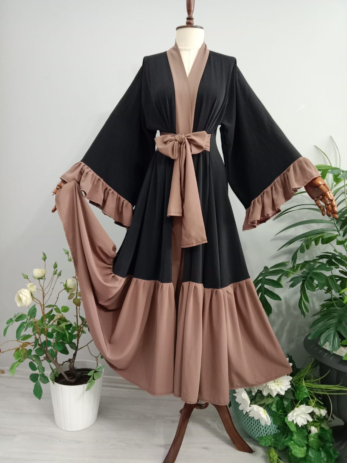 Abaya Dubai İpeğinden Siyahlı Sütlü Kahveli Kolları Fırfırlı.
