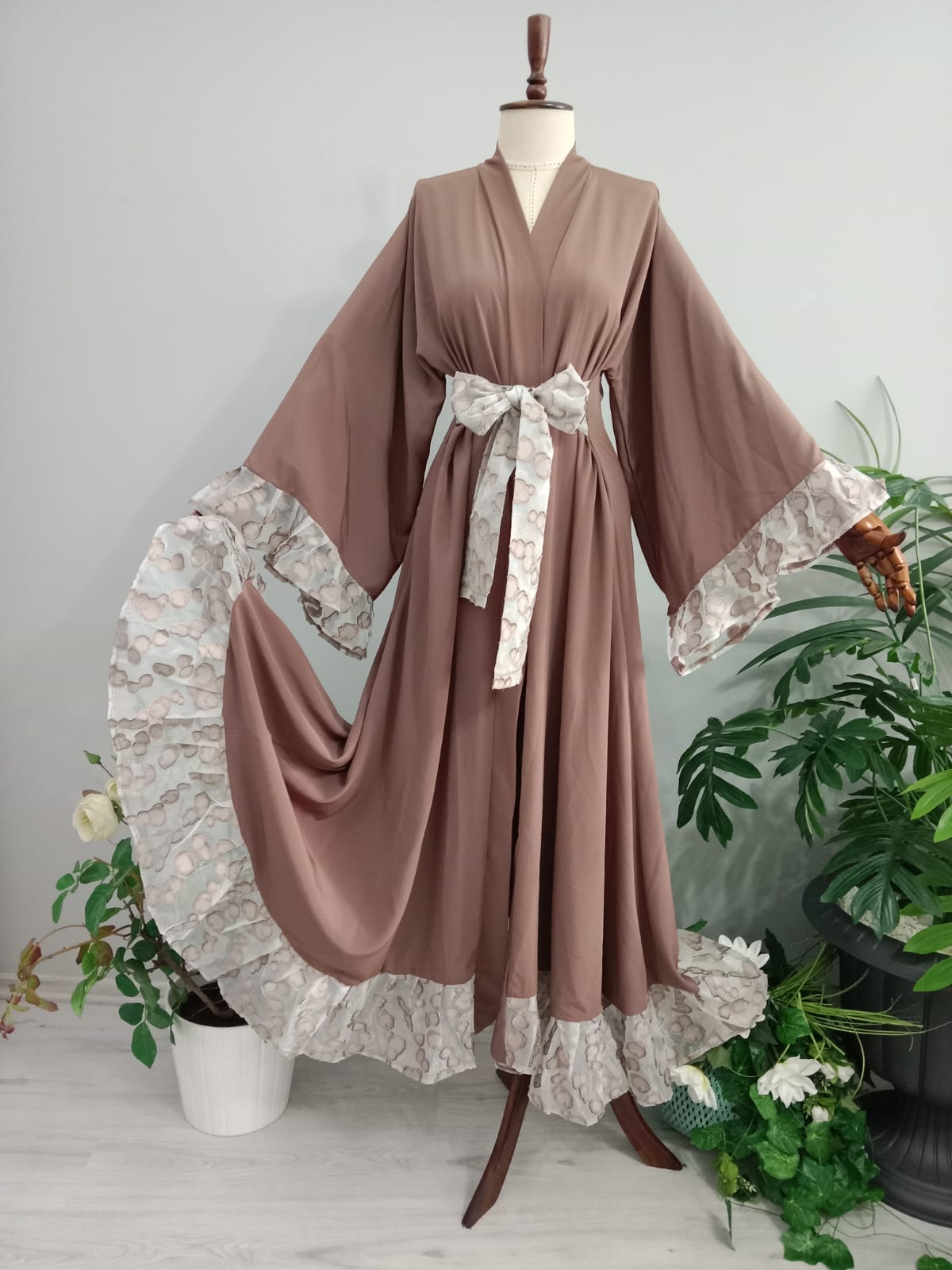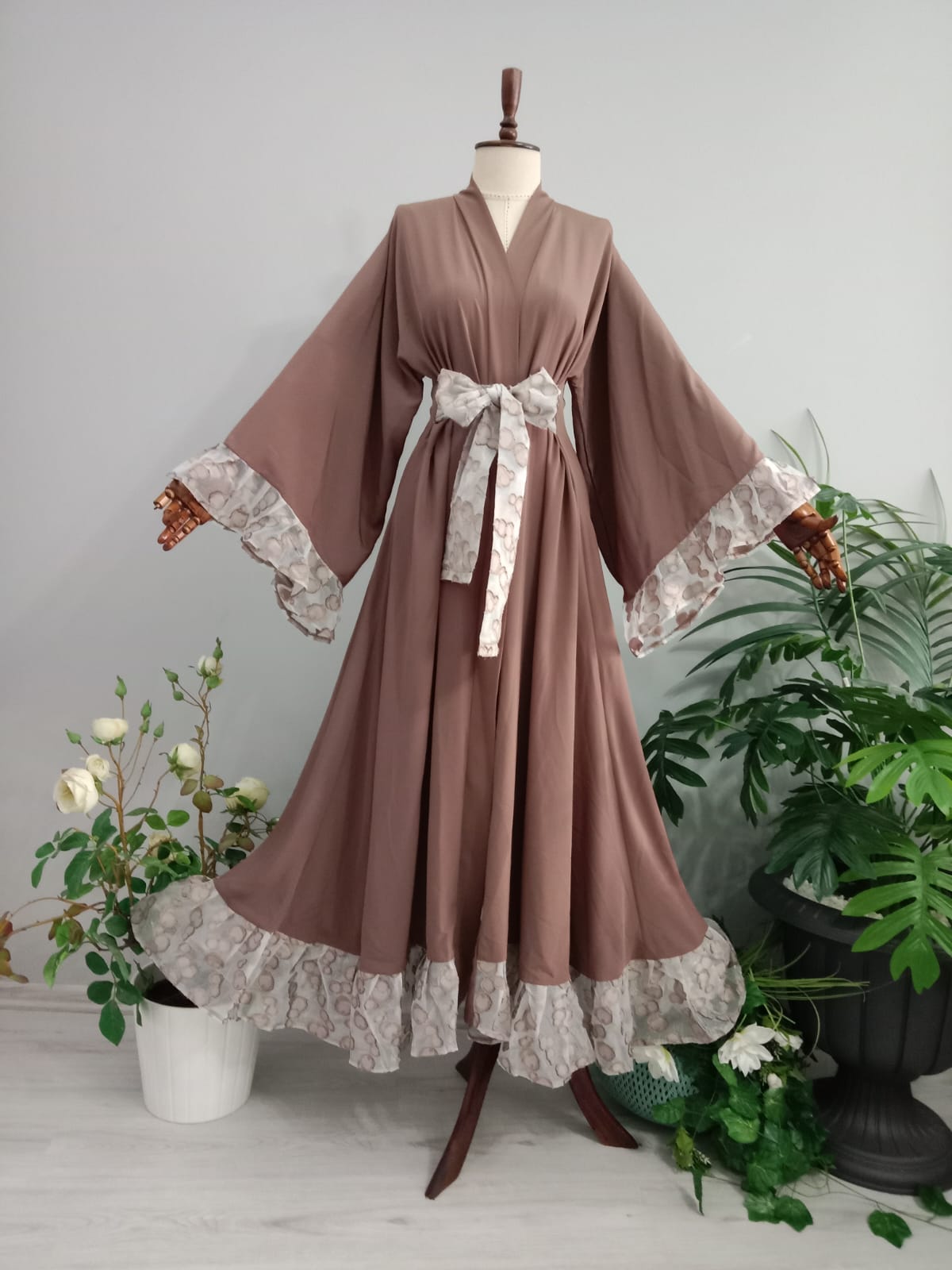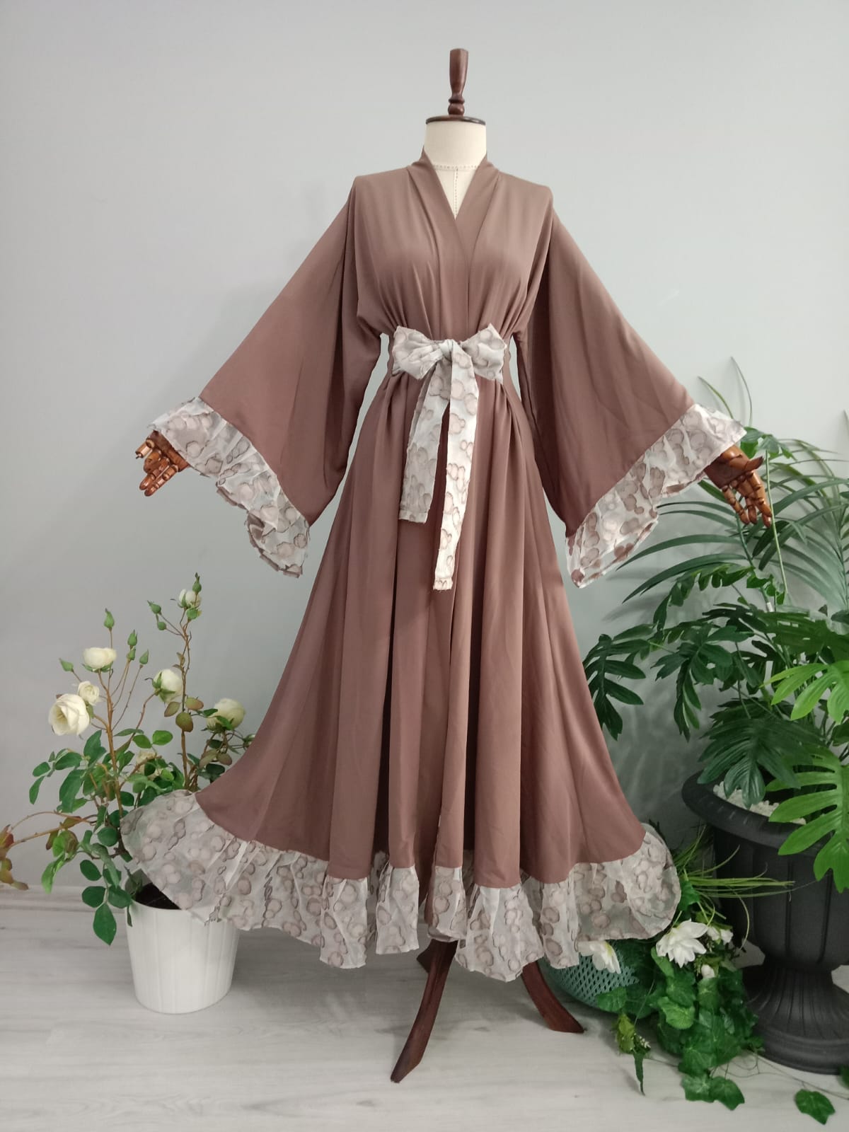 Abaya Medine İpeğinden Sütlü Kahve Renkli Kolları ve Eteği Fırfırlı.