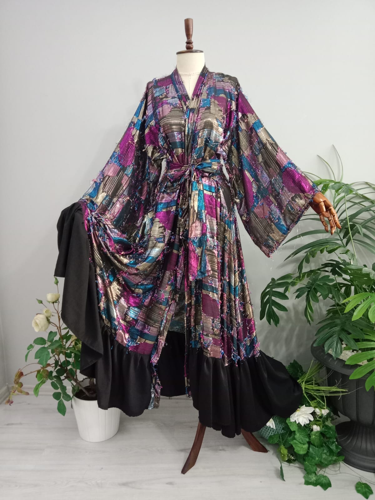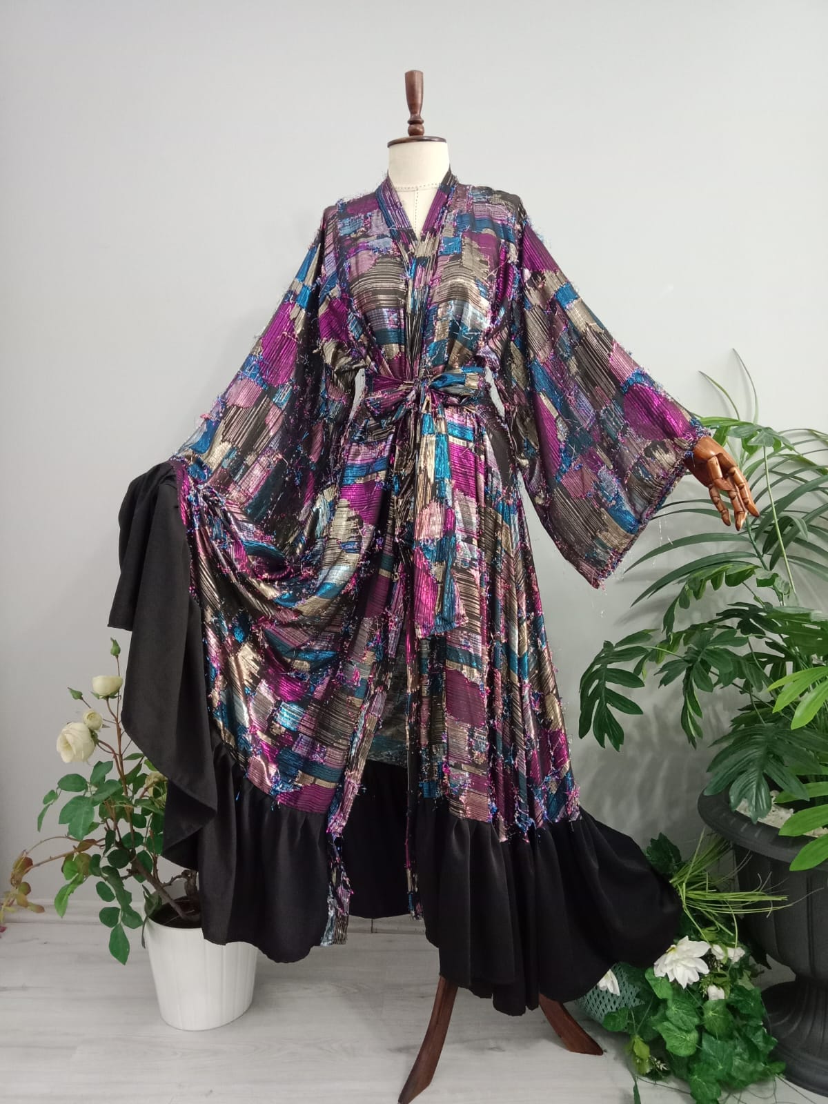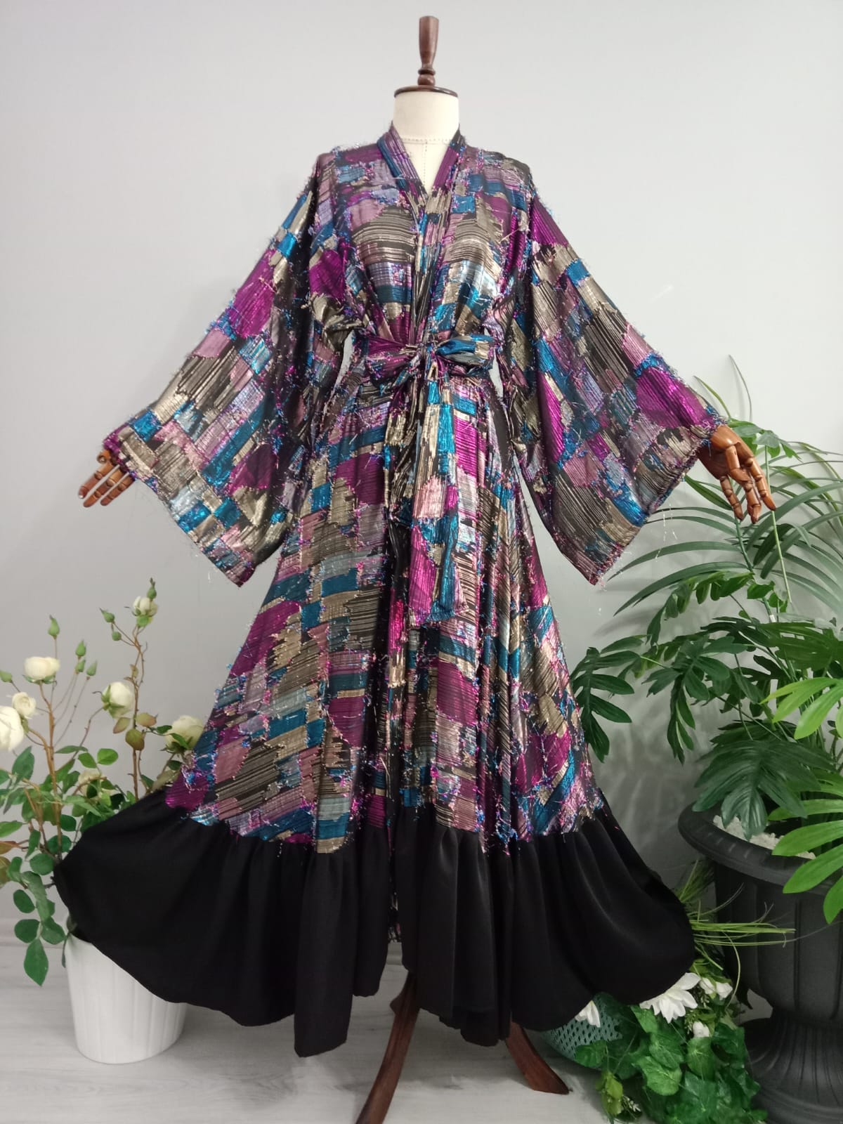 Abaya Saçaklı Şifon Kumaştan Desenli Etekleri Fırfırlı.