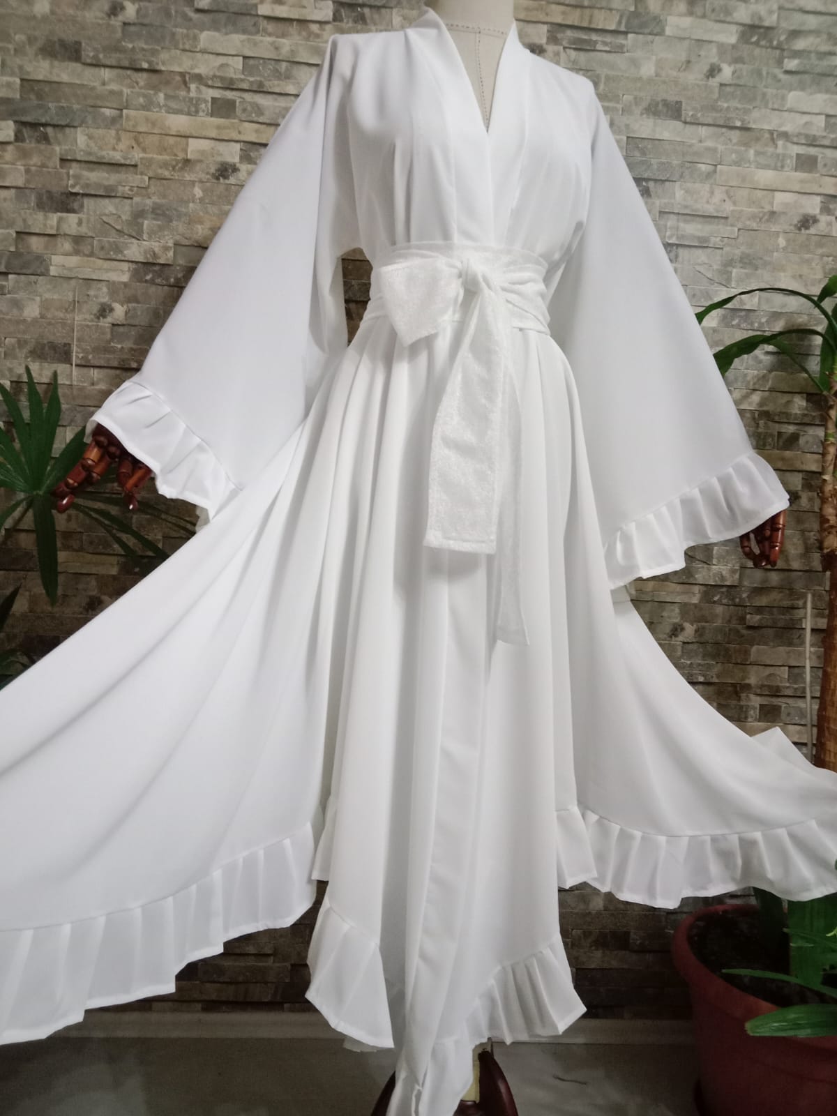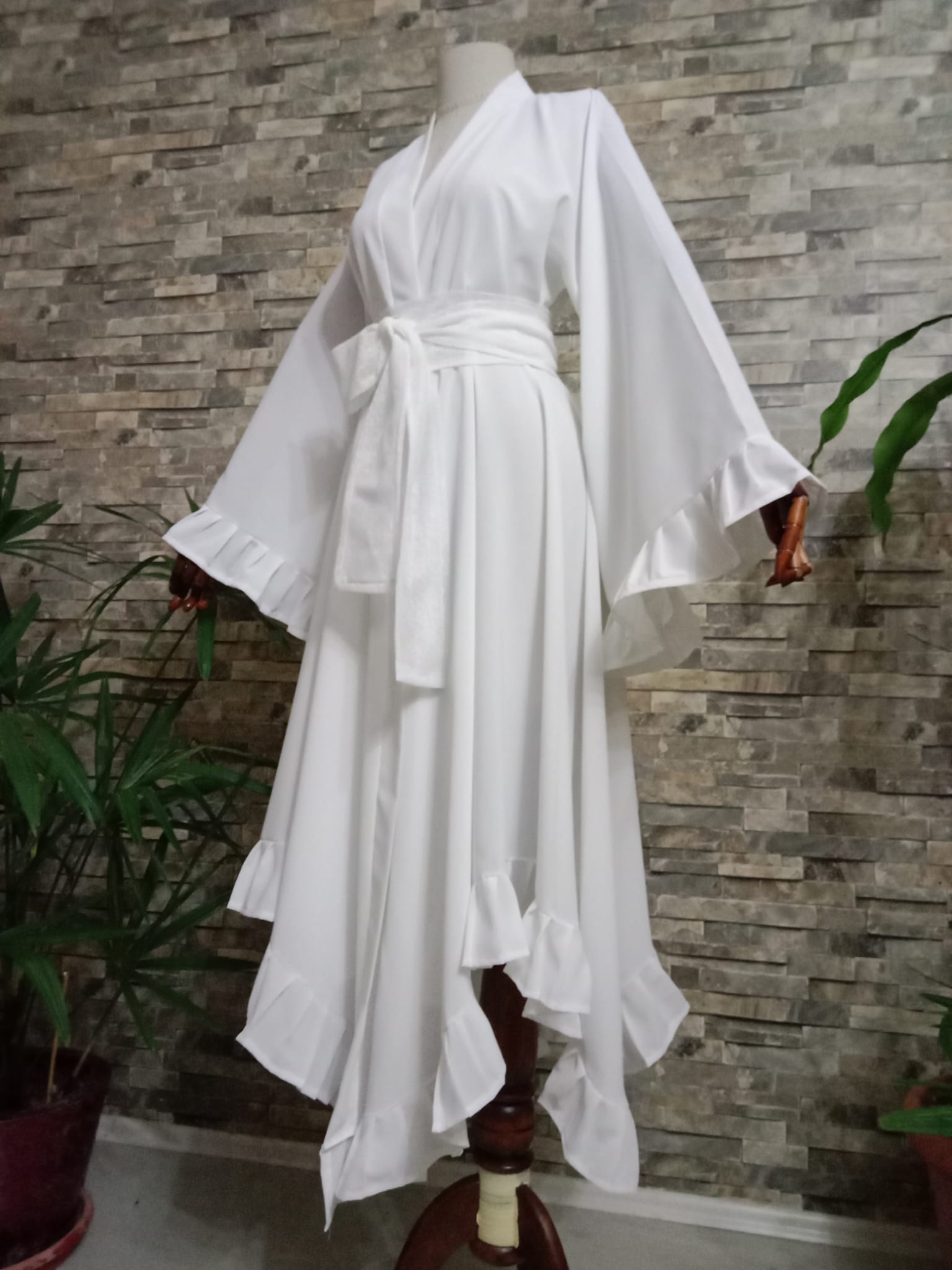 BEDEN: 34 - 38 STANDART BEDEN ELBİSE BOYU: UZUN KISIMLARI: 140 CM KUMAŞ TÜRÜ: KREP ŞİFON RENK: BEYAZKUŞAK: SABİT