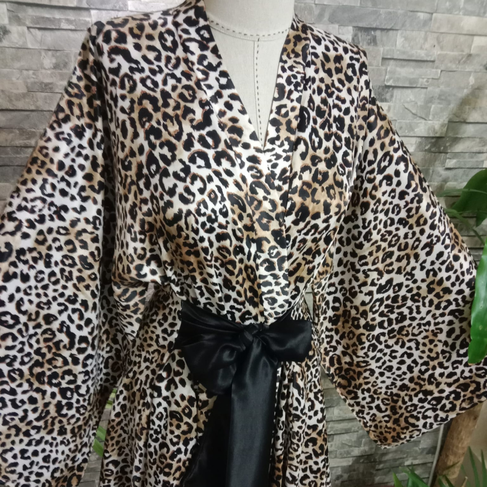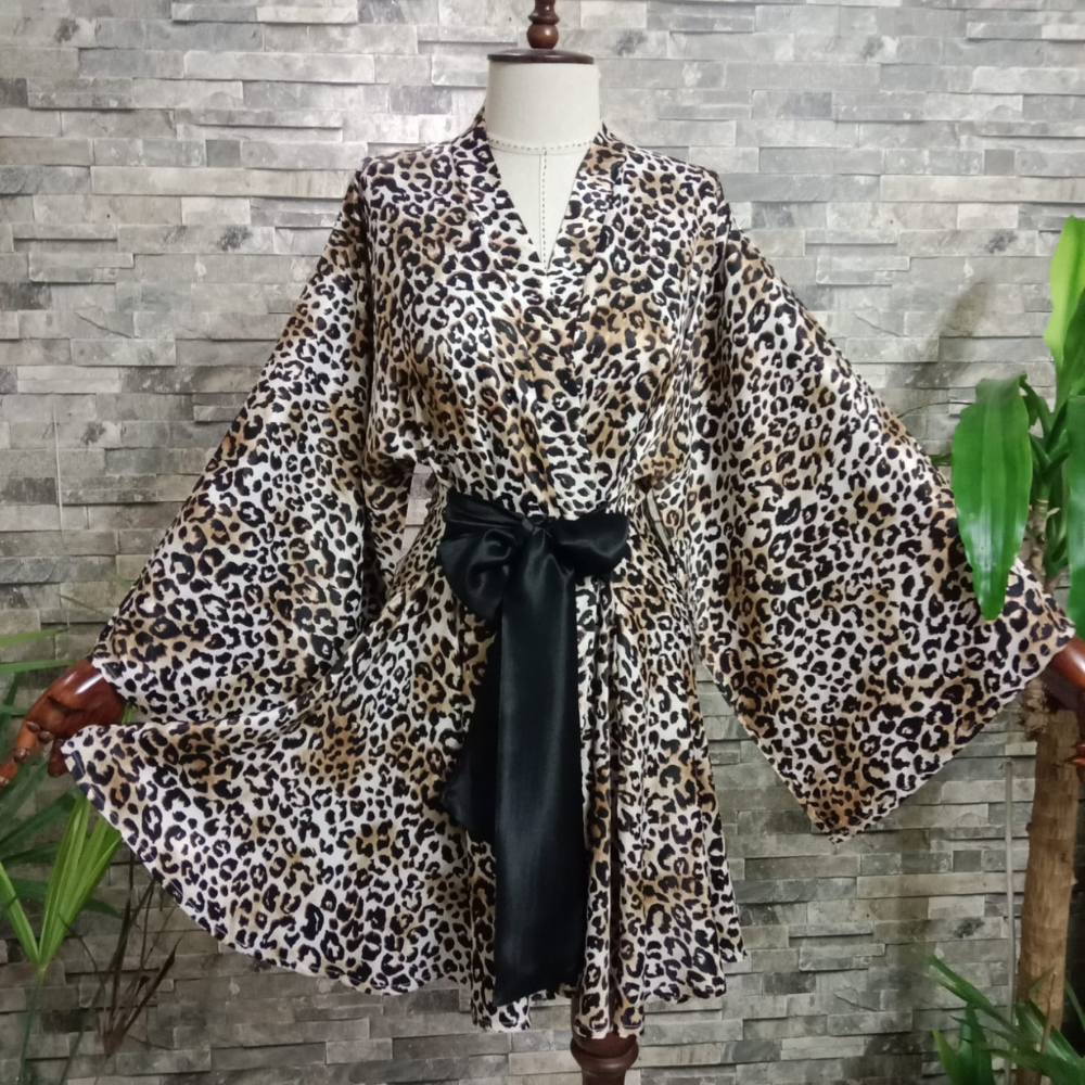 Viskon Saten Kumaştan Leopar Desenli Tasarım Kısa Kimono.